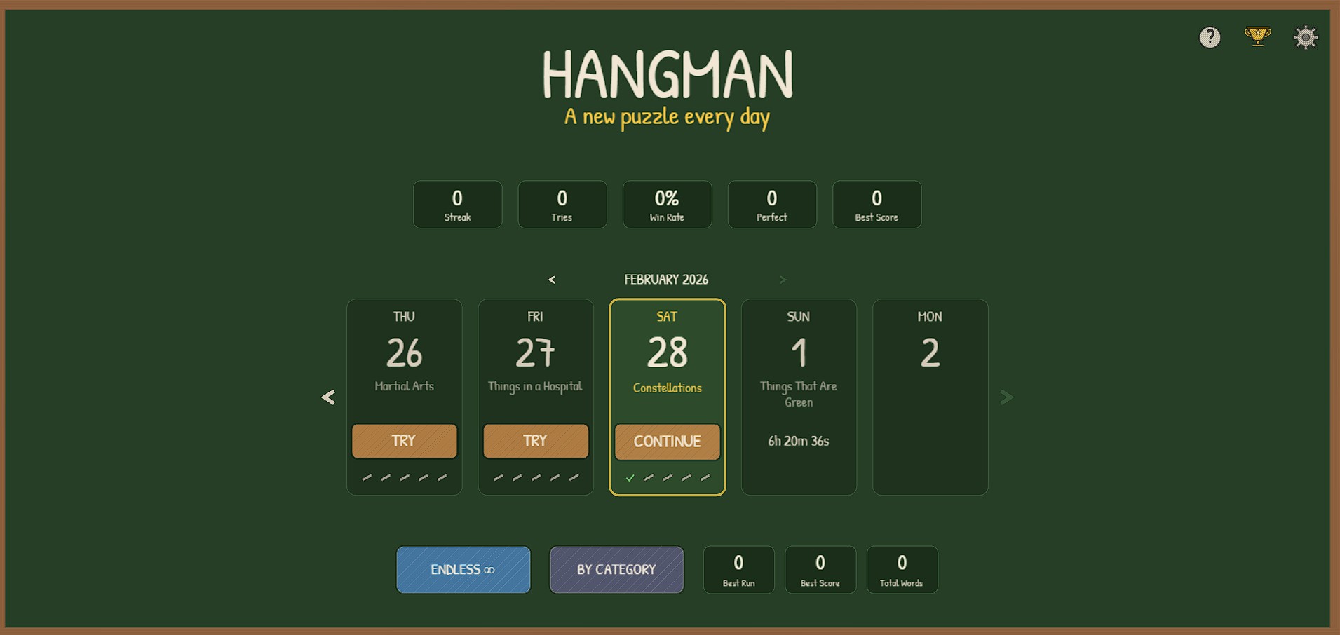A daily hangman puzzle with a chalkboard vibe. A new word drops every day — guess it before the chalk man swings.